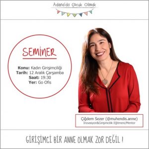 Katılım @adanadacocukolmak instagram sayfasından sağlanmaktadır. Adana’da Çocuk Olmak olarak düzenlediğimiz @muhendis.anne Çiğdem Sezer seminerimizin konusu “Kadın Girişimciliği”. Girişimci olmak isteyen kadınlarımızın yoluna ışık tutabilmeyi amaçlıyor ve 12 Aralık Çarşamba günü Saat 19:30’da hayallerini gerçeğe dönüştürmek isteyen tüm kadınları Goofis’e bekliyoruz. 🌿Özellikle anne olduktan sonra aklınıza yeni iş fikirler mi gelmeye başladı? 🌿Bir iş fikriniz var ama nereden nasıl başlayacağınızı henüz bilemiyor musunuz? 🌿Kurumsal hayat veya ev hanımlığı temposu sizi mutsuz mu etmeye başladı? Belki bir annesiniz, ya da anne adayı,…