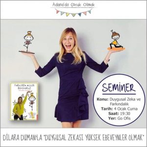 Katılım @adanadacocukolmak instagram sayfası üzerinden gerçekleşmektedir. “Farkında mısın Büyüyoruz” kitabının yazarı ve eğitmen Dilara Duman Adana’ya geliyor ve 4 Ocak Cuma günü Saat 19:30’da ebeveynlerle @goofistr ‘de buluşuyor. Duygusal zekasını geliştiren bireyler yüksek özgüvenle hareket etmekte, daha sağlıklı olmakta, okulda ve iş dünyasında daha yüksek performans göstermektedirler. Peki siz büyüyen çocuğunuzun ve kendinizin duygularının farkında mısınız, ona nasıl yardımcı olabilirsiniz? 🌿Duygusal zeka nedir ve duygusal zekanız hangi seviyede? 🌿Kendiniz ve çocuğunuz için duygusal zekayı nasıl kullanabilir ve hayatınızı güzelleştirebilirsiniz? 🌿…