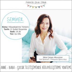 Katılım için @adanadacocukolmak instagram hesabından mesaj atabilir veya merhaba@adanadacocukolmak.com mail adresine mail atabilirsiniz. Nihal Çalışan Altunsüzer’le ikinci seminerimizi 21 Şubat Perşembe Saat 19:30’da @goofistr ‘te gerçekleştireceğiz. Konumuz “Anne - Baba-Çocuk iletişiminde Hikayeleştirme Yöntemi”. Seminerimizde neler var? Beynin dili hikayedir. Bu dili kullanarak, çocuklarımızla kaliteli, eğlenceli ve öğretici zaman geçirebiliriz. Yeni bir konu öğretirken, öğrendiği konuların kalıcılığını artırırken ya da herhangi bir ortamda olması gerekenleri vurgularken Hikayeleştirme Yöntemini kullanmak çok faydalı olmaktadır. Bu seminerde bu yöntemin püf noktalarını, hangi durumlarda kullanılacağını…