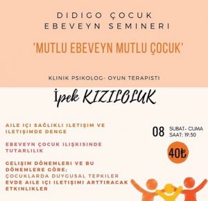 Klinik Psikolog İpek Kızılok ile “Mutlu Ebeveyn, Mutlu Çocuk” konulu ebeveyn semineri 8 Şubat 19:30’da Didigo Çocuk’ta. Rezervasyon: 0322 881 11 11