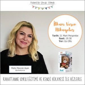 Katılım için @adanadacocukolmak instagram hesabına mesaj veya merhaba@adanadacocukolmak.com adresine mail gönderebilirsiniz. “İlham Veren Hikayeler” ‘in dördüncüsünü @rahattanne ile 21 Mart Perşembe @goofistr ‘de gerçekleştiriyoruz. Konuğumuz @rahattanne Melis Mavruk Ayan. www.rahattanne.com blogunda ve instagram hesabında annelerle uzman görüşlerini, kendi deneyimlerini ve deneyimlediği markaları paylaşıyor. Aynı zamanda @adanalianneler hesabını yönetiyor, atölyeler, etkinlikler düzenliyor. Ayrıca Kasım 2018’den beri Family Sleep Institute 0-6 yaş Uyku Eğitimi Danışmanlık hizmeti vermektedir. Peki bu kısa zamanda sığdırdığı geniş tecrübeyle kendisinden neler dinleyeceğiz ? Blogger anne olmanın…