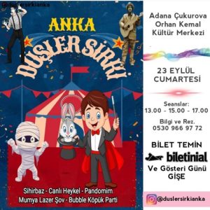 2 yaş ve üzeri 23 Eylül 2023 13:00/15:00/17:00 (3 seans) Sihirbaz illüzyon gösterisi, canlı heykel - pandomim gösterisi (kısa tiyatro), mumya lazer şov, bubble ve köpük partisi Anka Düşler Sirki'nde!