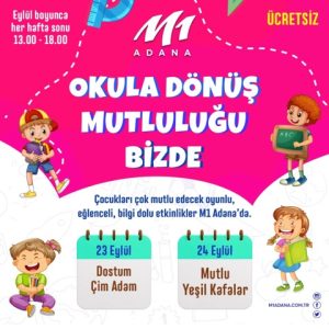 Ücretsiz 6-12 yaş Okula dönüş mutluluğu bizde! Çocukları çok mutlu edecek oyunlu, eğlenceli, bilgi dolu etkinlikler M1 Adana’da! Atölyelerimizin kontenjanı sınırlıdır. Katılmak için M1 Adana mobil uygulamasını indirmeniz gerekmektedir. Kayıtlar etkinlik günü etkinlik alanında yapılacaktır.