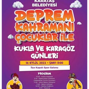 Ücretsizdir Kültür ve Turizm Bakanlığımız ile ortaklaşa düzenlemiş olduğumuz “Deprem Kahramanı Çocuklar ile Kukla ve Karagöz Günleri” programımıza tüm çocuklarımızı bekliyoruz. Karataş Kapalı Spor Salonu