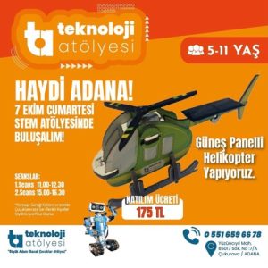 5-11 yaş 1.Seans 11:00-12:30 2.Seans 15:00-16:30 Bu atölyede @teknolojiatolyesitim tarafından çocuklarımız güneş paneli helikopter yapıyor. Etkinlik akışı: Yenilenebilir enerji konusunda sinevizyon. Daha temiz bir dünya için beyin fırtınası Ürün inşaası Fotoğraf çekimi Kazanımlar: Yenilenebilir enerji kaynakları hakkında bilgilenir. Güneş panellerini tanır. Motor gücüne göre doğru güneş panellerini kullanmayı öğrenir. Tümevarım becerilerini geliştirir. Dikkat ve odaklanma becerileri gelişir. * konsept gereği katılım sırasında çocukların sarı renk giymesi rica olunur.