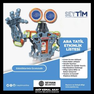 Seyhan Belediyesi Teknoloji ve İnovasyon Merkezi http://www.seytim.org/etkinlikler.html internet sitesinden tüm etkinlikler için kayıt oluşturabilirsiniz. 11-15 Nisan Ücretsiz