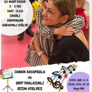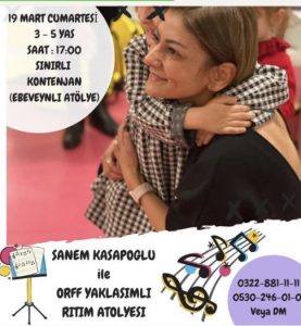 Sanem Kasapoğlu ile Orff Yaklaşımlı Ritim Atölyesi Didigo Çocukta 19 Mart Cumartesi 15-30 Ay Saat 16:00’da 3-5 Yaş Saat: 17:00’de Rezervasyon: 0322 881 11 11 veya 0530 246 01 01