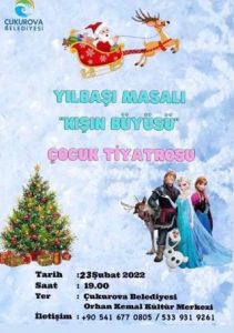Yılbaşı Masalı “Kışın Büyüsü” 23 Şubat Çarşamba günü Saat 19:00’da Çukurova Belediyesi Orhan Kemal Kültür Merkezi’nde. Biletler etkinlik günü gişeden alınabilir Bilet: 55 TL İletişim: 0541 677 08 05