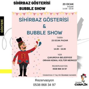 3-12 Yaş Sihirbaz gösterisi ve Bubble Show Çukurova Belediyesi Orhan Kemal Kültür Merkezi’nde Saat 14:00 ve 16:00 ‘da Rezervasyon: 0538 868 34 97 3 yaş altı ücretsiz