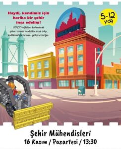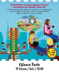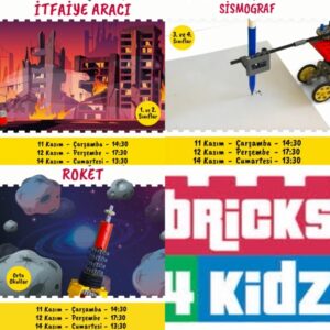 3 yaş üstü Bricks4kidz ile çocuklar legolarla figürler oluşturuyorlar. Eğlenirken öğreniyorlar. 15 Kasım Pazar 1. ve 2. Sınıflar – Saat 13:00 - İtfaiye Arabası 3.ve 4. Sınıflar – Saat 15:00 Sismograf Orta Okullar - Saat 15:00 Roket Düzenli atölyelere günlük ,aylık ve dönemlik kayıt olabilirsiniz. Tek günlük katılım hafta sonları 90 TL. İletişim: 0549 540 84 04