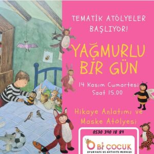 Obi Çocuk Oyun Evinde 14 Kasım Cumartesi Saat 15:00’te hikaye anlatımı ve maske atölyesi 1 saat atölye +1 saat oyun alanı kullanımı 60 TL Rezervasyon: 0530 390 18 89