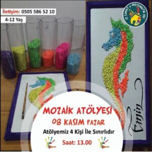 4-12 Yaş İz Sanat ve Matematik Evi’nde 8 Kasım Pazar günü Saat 13:00’te mozaik atölyesi. Kontenjan 4 çocuk ile sınırlıdır. Rezervasyon: 0505 586 52 10