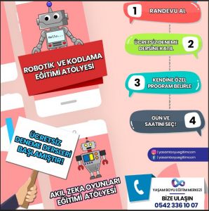 6-14 Yaş Yaşam Boyu Eğitim çok kısa süre önce çocuklar için Zeka ve Yetenek Geliştirme Atölyesini açtı. Pazar ve Pazartesi günleri Saat 17:00-18:30 arası ücretsiz deneme dersi uygulanacaktır. Atölyenin kurulum amacı çocuklarımızın eğlenerek öğrenmesini ezberci bir yaklaşımda uzaklaşarak üretken bir birey olarak yetişmesi, ön görme becerilerini geliştirmesi buna bağlı olarak bir sonraki adımı düşünerek hareket etmesidir. Gitmeden önce mutlaka randevu alınız : 05423361007