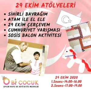 Obi Çocuk’ta 29 Ekim atölyeleri *Sihirli bayragim *Atam ile el ele *29 ekim çerçevem *Cumhuriyet yarışması *Sosis balon aktivitesi 5 atölye ve cumhuriyet etkinlikleri Hepsi toplam 100 tl dir 1.Seans: 14:00-16:00 2.Seans: 17:00-19:00 Özel not :Katılımcı ebeveyn ve çocuklarımızın kırmızı beyaz renk giymesini önemle rica ederiz