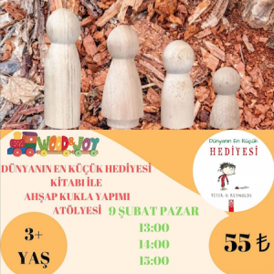 3 YAŞ ÜZERİ Ahşap Oyuncak Atölyesine bir kitap eşlik ediyor.Peter H. Reynolds’ın yazmış olduğu Dünyanın En Küçük Hediyesi Atölyesinde hikaye okunurken çocuklarımız ham ahşap kuklalar ve renklerle buluşuyor hem de hikayemin kahramanlarınını kendileri tasarlıyor. Seanslar: 13:00 - 14:00 - 15:00