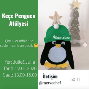 22.01.2020 Çarşamba Günü Julie&Julia da Keçe Penguen Atölyesi. Kontenjan 10 kişi ile sınırlıdır.