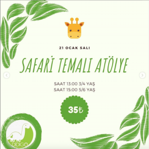 21 Ocak 13:00 - Taş Boyama / Tablo Yapımı 22 Ocak 13:00 - Doğadan Malzemeler ile Fotoğraf Çerçevesi Yapımı 23 Ocak 13:00 - Alçı Kalıp Atölyesi ile Denizler Altı 28 Ocak 13:00 - Ağaçların Keşfi ve Hayat Ağacı Yapımı 29 Ocak 13:00 - Rüzgar Çanı Yapımı 30 Ocak 13:00 - Ormanlar İle İlgili Masal Anlatımı / Tablo Yapımı ***ÜCRETLER KOZAN ÇANDIK İLKOKULU'NA BAĞIŞLANACAKTIR.