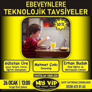 Günümüzde malesef bir çok çocuk teknoloji bağları olmadan yemek yemiyor, tablette oyun oynamaya izin vermediğinizde ders çalışmıyorlar. Günden güne büyüyen bu tehlikeyi ele alınacağı ve birlikte kalıcı çözümler bulacağınız "Ebeveynlere Teknolojik Tavsiyeler" adlı söyleşiye tüm anne-babalar davetlidir. *Tüm katılımcılara NUTUK kitabı ve Katılım Belgesi verilecektir. Kayıt : 0538 613 0163