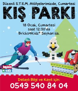 3 yaş üstü Bricks4Kidz Seyhan’da lego ile stem atölyelernde bu hafta tema kış parkı. Düzenli atölyelere günlük ,aylık ve dönemlik kayıt olabilirsiniz. Tek günlük katılım 70 TL. iletişim: 0549 540 84 04