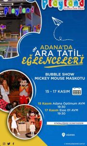 Ücretsiz Adana’da Ara Tatil Eğlencesi Play Land Center Merkezinde. Bubble Show ve Mickey Mouse Maskotu ile Çocuklar çok eğlenecek. Rezervasyon ve bilgi için: @playlandeglencemerkezi sayfasına mesaj atabilirsiniz.
