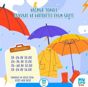 18-24 ay 10:00 24-36 ay 11:00 36-48 ay 12:00 18-24 ay 14:00 Yağmur Temalı Hareketli Oyun Saatinde @muzipokidsadana’da çocukları çok eğlenceli bir atölye bekliyor. Rezervasyon ve bilgi için: @muzipokidsadana sayfasına mesaj atabilir, 0533 408 8212 numaralı telefonu arayabilirsiniz.