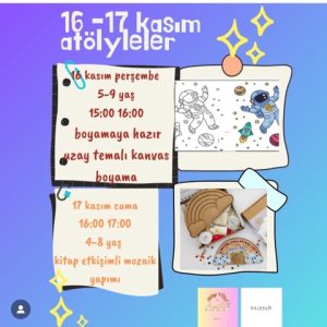 5-9 yaş Ara tatil etkinliklerinden sanat dolu bir etkinlik sizleri bekliyor. @atolyevina’nın hazırlamış olduğu bu etkinliğe çocuklar bayılacak. Rezervasyon ve bilgi için: @atolyevina sayfasına mesaj atabilirsiniz.