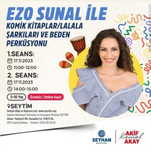 Ücretsiz 5-10 yaş 2 Seans 11:00-12:00/14:00-15:00 Ezo Sunal ile bir araya gelmeye hazır mısınız? Ezo Sunal, arşivindeki eğlenceli ve interaktif çocuk kitaplarını, oyun ve eğlenceli bir şekilde okuyor anlatıyor. Rezervasyon ve bilgi için: www.seytim.org adresini ziyarete edebilir, 0535 011 0453 numaralı telefonu arayabilirsiniz.