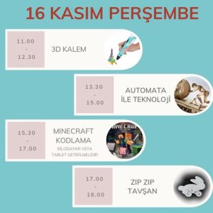 5-10 yaş Mühendis Kübra Aytekin’in hazırladığı bu ara tatil programında, minikler eğlenerek öğrenecek. Rezervasyon ve bilgi için: @muhendis_kubra.aytekin adresine mesaj atabilirsiniz.