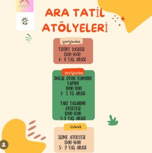 4-8 yaş @atolyevina tarafından çocuklar için Ara Tatil’de düzenlenen bu atölyede önce akıl zeka oyunları oynayıp ardından tişört baskısı yapılacaktır. Rezervasyon ve bilgi için: @atolyevina sayfasına mesaj atabilirsiniz.