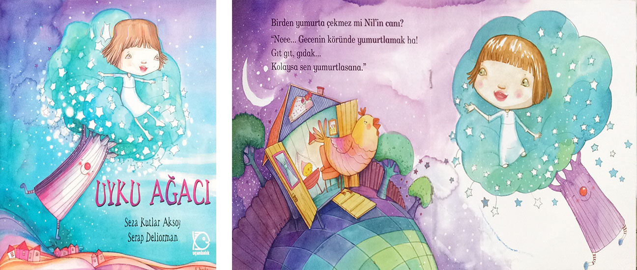 Seza Kutlar Aksoy’un yazdığı ve Serap Deliorman’ın resimlediği Uyku Ağacı, Uçan Balık yayınlarından. Çok uzun olmaması, konusu ve resimleri ile bu hikâyemiz de küçük yaşa hitap edebilir nitelikte. Bu hikâye de o kadar bizden ki. Tam uykuya hazırlanırken “Anne çişim, anne babamı öpmedim” ve hatta o kadar ki Simla’nın iştahsız olmasına rağmen “Acıktım” bile demesi gibi, hikâyedeki Nil de bir türlü uykuya dalmak istemiyordu. Anlatırken annesi bilgiç kedi masalını, birlikte uçtular renkli düş ülkesine. Doğa nasıl uykuya dalıyorsa, uyumayanlarda var, masalcı ay ve paten kayan yıldızlar gibi. Gerçeklik algısı düş öğeleri ile beslenerek yaratılmış bir uyku hikâyesi.
